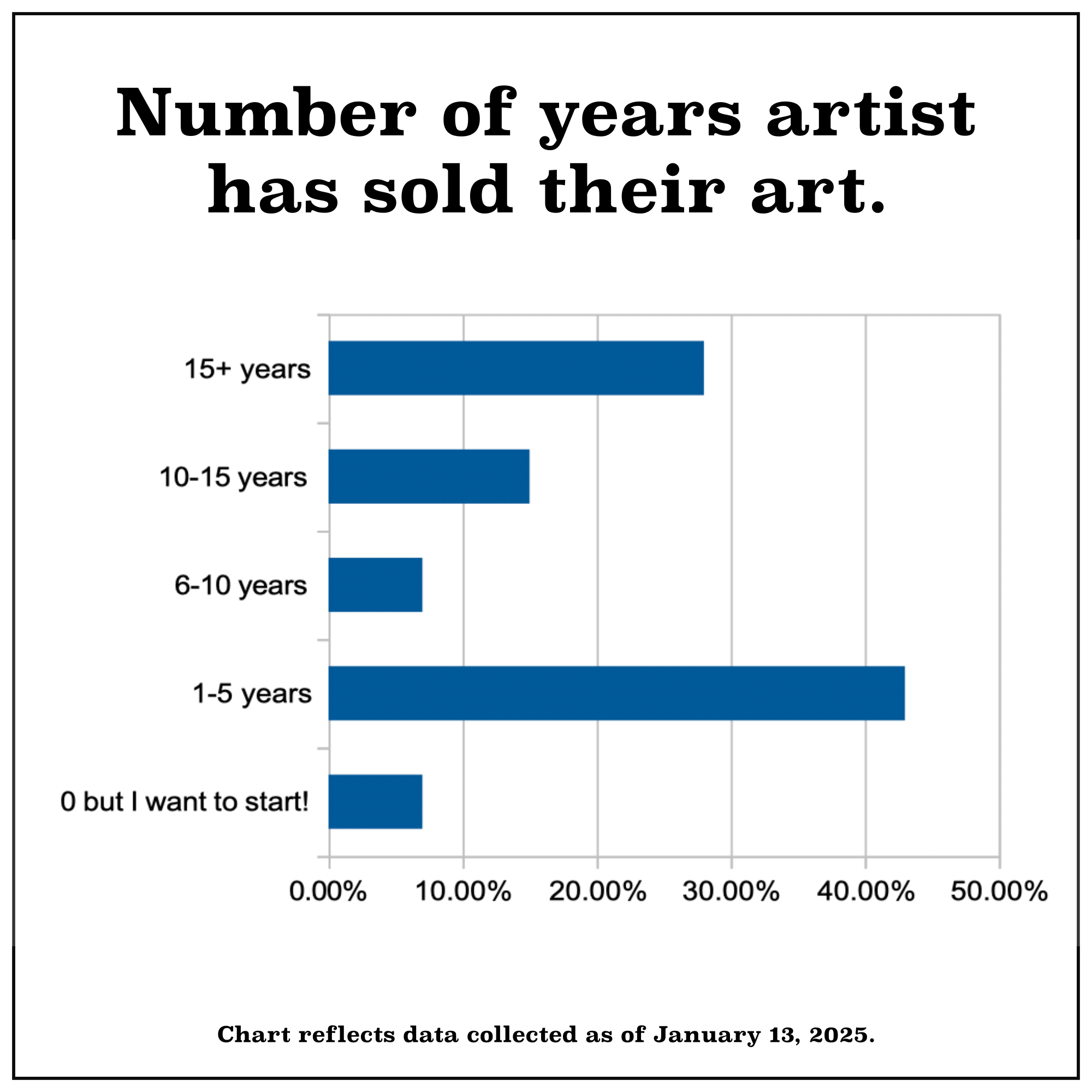 This data set has some potential for inaccuracy. Since launching our Artist Survey, the wording of this question has been modified to be less cute, and more easily understood. For example, we no longer ask artists if they’ve been selling art longer than MV has had a rotary. Sorry about that. The creativity got away from us there. We’ve done our best to keep totals accurate while adjusting the answer parameters.